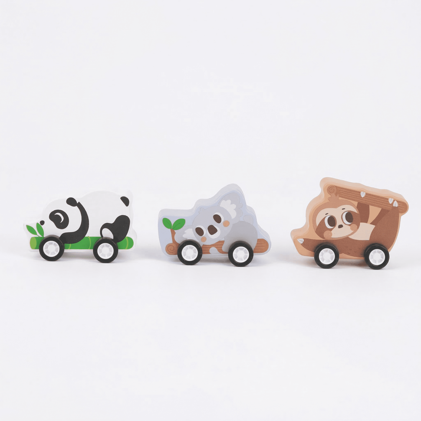 • 3 Wooden pull-back cars featuring Panda, Koala, and Sloth designs