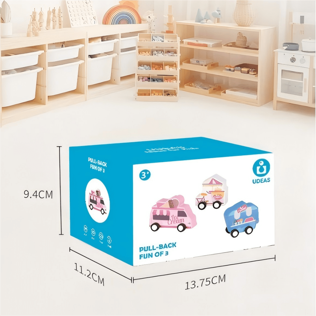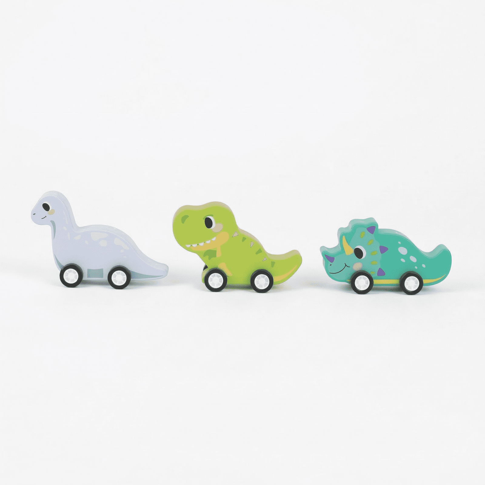 • 3 Wooden pull-back cars featuring Brontosaurus, T-Rex, and Triceratops designs