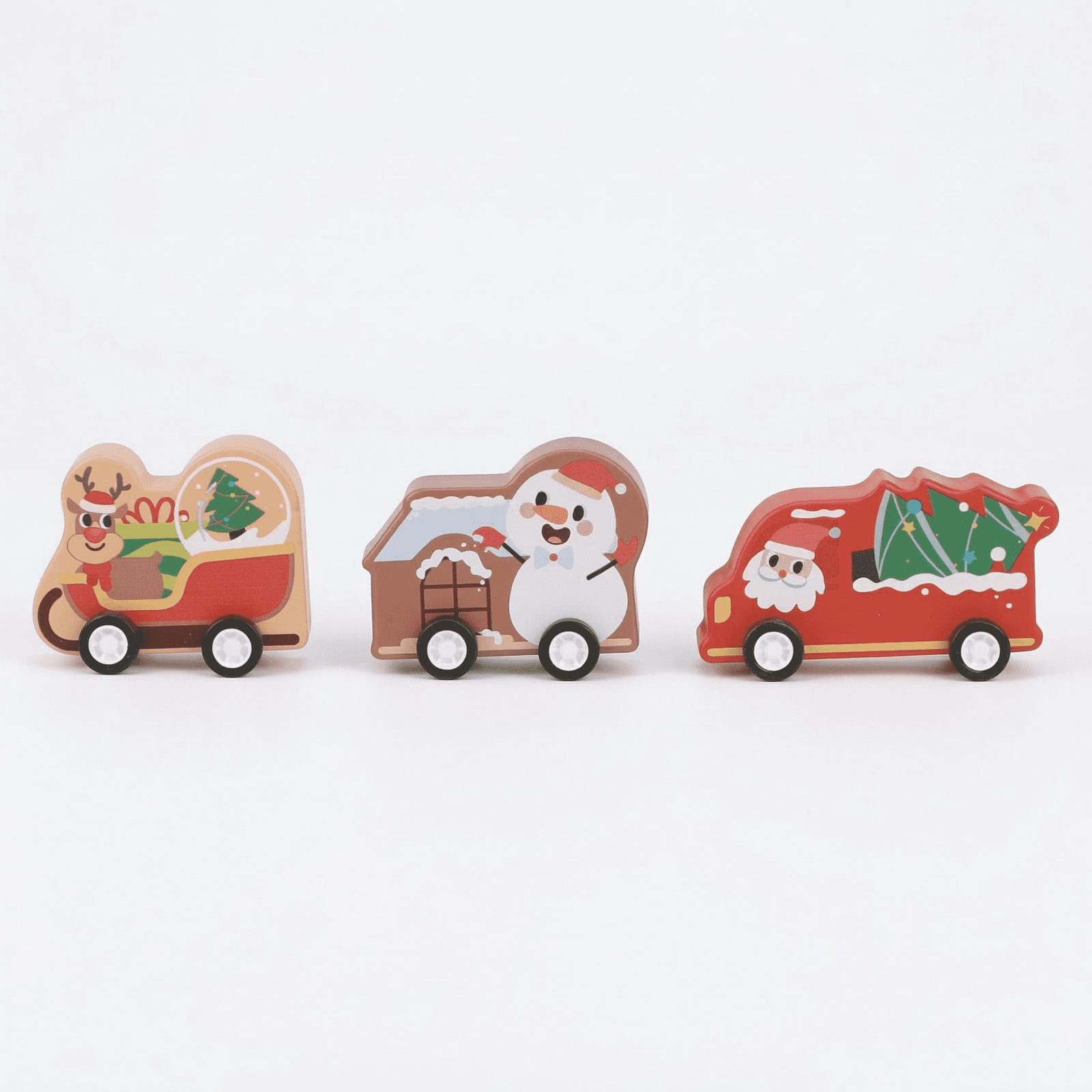 • 3 Wooden Christmas-themed pull-back cars (Santa, Snowman, and Reindeer)