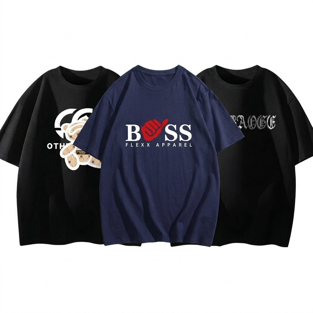 Men’s 3-Pack T-Shirt Combo: AICRAOGE Black + Boss Blue + Bear Print is a 3-piece mixed design men’s t-shirt combo available at Nakhelia UAE for AED 149. Each tee is 100% pure cotton for breathability and all-day comfort.